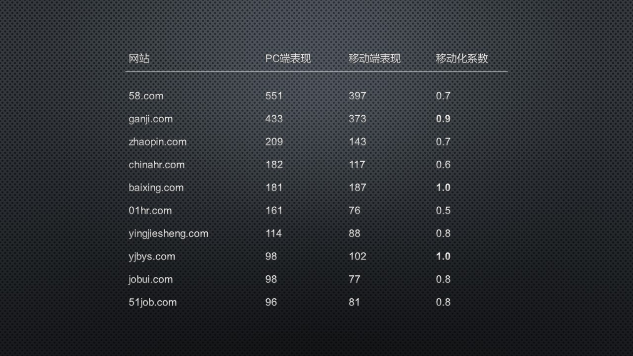圖中的數(shù)值計(jì)算方式和前面一樣,統(tǒng)計(jì)了一個PC端的相對流量情況,再加了個移動端的。之后再以移動端的數(shù)值除以PC端得到移動化系數(shù),這個值越高,就說明對應(yīng)網(wǎng)站的移動站SEO表現(xiàn)比起自己的PC站來得更好。