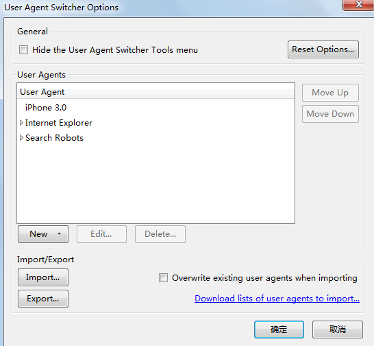 選擇“EditUser Agent”或“UserAgent Switcher”=>"Options",打開(kāi)如下的設(shè)置頁(yè)面。
