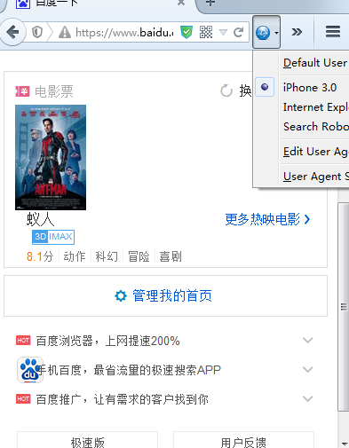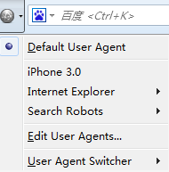 完成后,點(diǎn)擊工具欄上的按鈕,打開(kāi)UserAgent Switcher的菜單