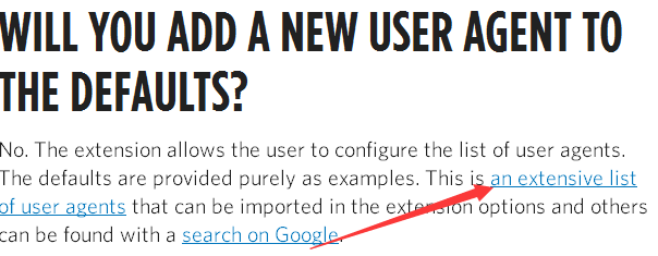 點(diǎn)擊右下角的“Downloadlists of user agents to import...”鏈接,在打開(kāi)的網(wǎng)頁(yè)中找到下圖中標(biāo)注的位置,我們可以找到最常用的UA列表了,這里直接給出列表的下載地址,方便大家下載。