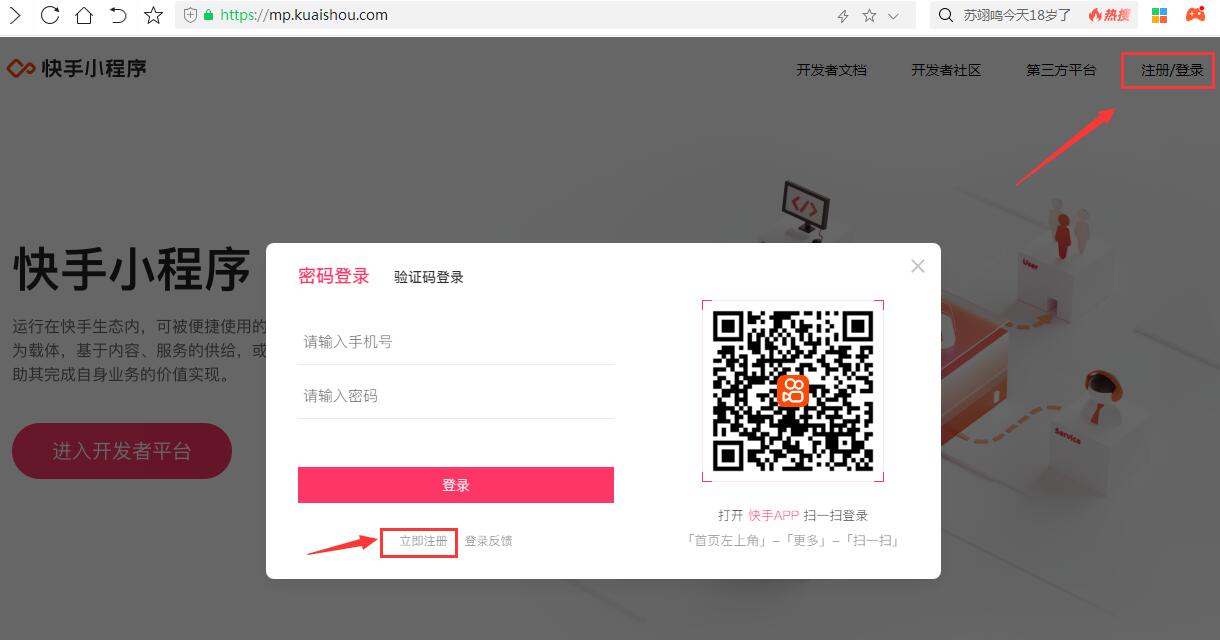 (1)登錄快手小程序官網(wǎng) https://mp.kuaishou.com/  點擊右上角“注冊/登錄”,“立即注冊”,進行帳號注冊。