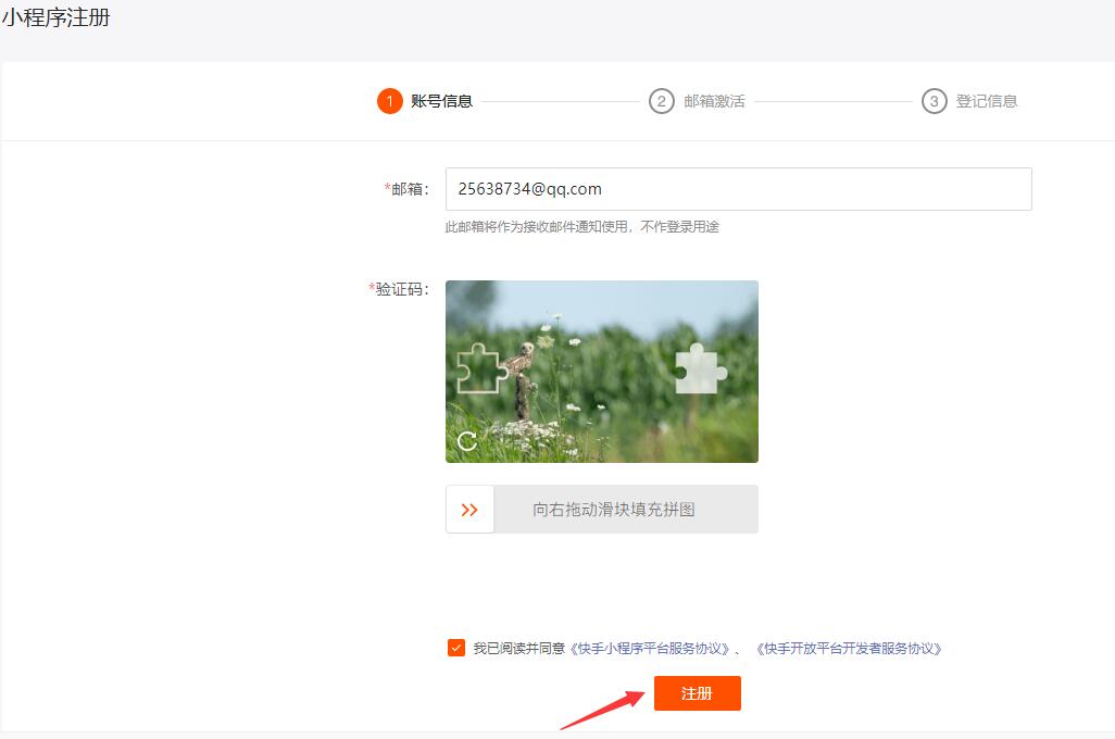 進入“小程序注冊”界面,填寫帳號信息:郵箱、驗證碼,勾選服務(wù)協(xié)議,然后點注冊。