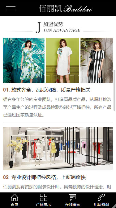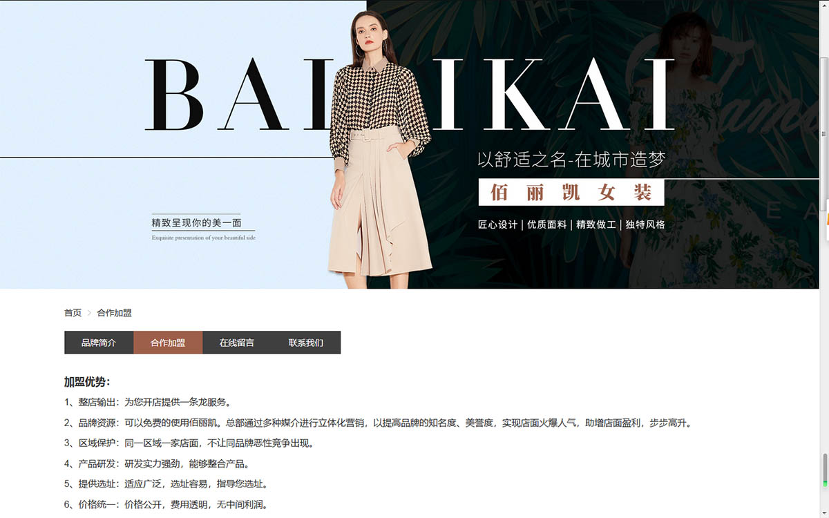 風(fēng)信網(wǎng)絡(luò)響應(yīng)建站某服裝品牌公司致力為現(xiàn)代女性提供時(shí)尚完美生活,巧妙的將各類時(shí)尚元素與東方人的甜美優(yōu)雅氣質(zhì)融合到一起,精選進(jìn)口優(yōu)質(zhì)面料,做工細(xì)膩。